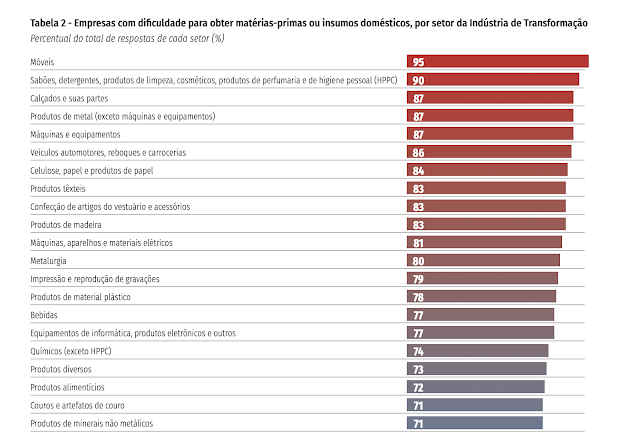 No setor de móveis, a dificuldade para conseguir insumos afeta 95% das empresas. Em 21 dos 27 segmentos analisados na Sondagem Especial o percentual de executivos que relatam problemas para conseguir a matéria-prima é igual ou superior a 70%. O índice de indústrias com dificuldades subiu em 24 dos 27 setores avaliados.